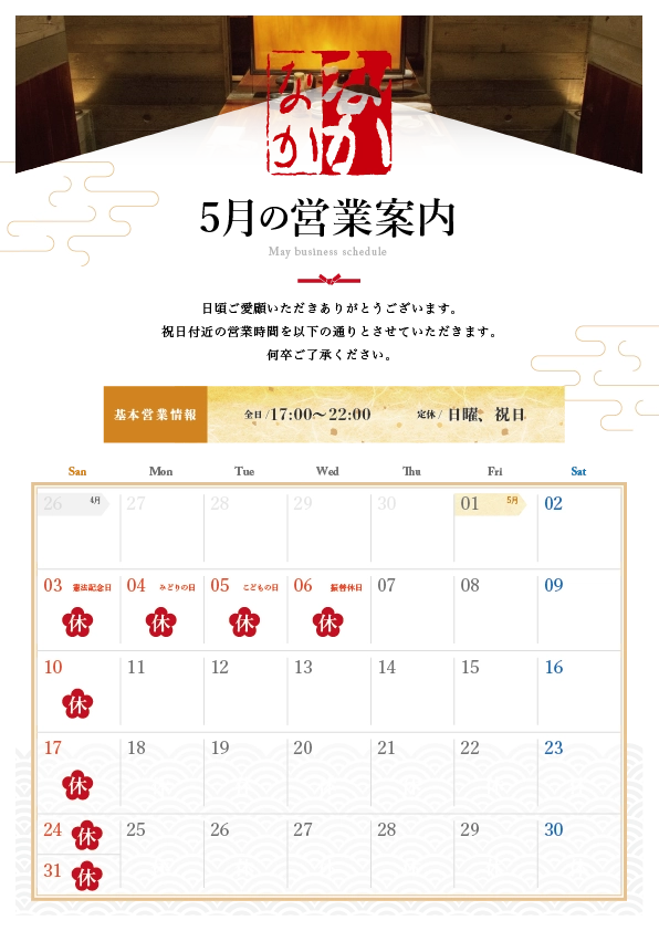 定休日が日曜・祝日のため、カレンダー通りのお休みとなります。