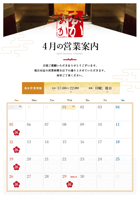 4月5月の営業カレンダーをご用意いたしました。